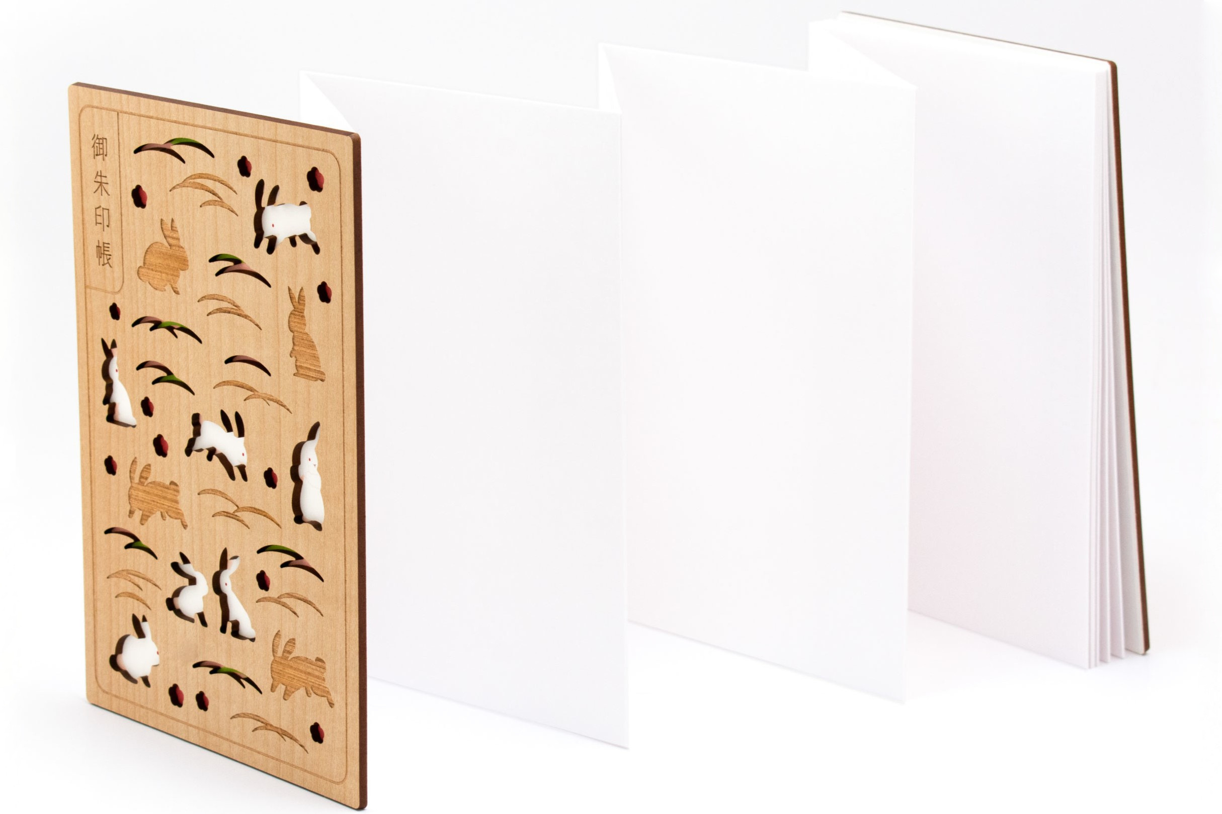 レーザー加工を施した木素材で表紙を仕立てたオリジナル御朱印帳です。
