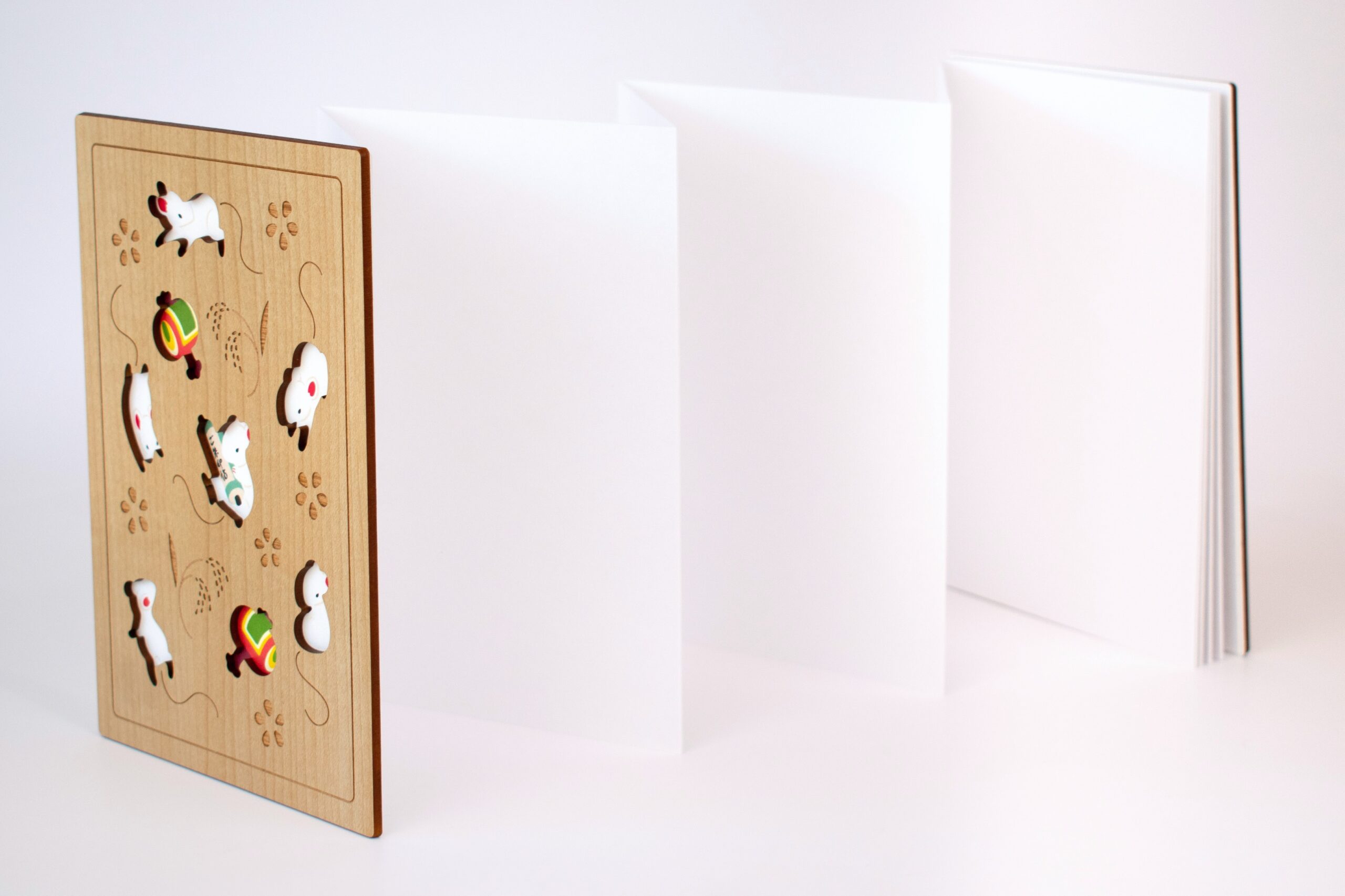 レーザー加工を施した木素材で表紙を仕立てたオリジナル御朱印帳です。