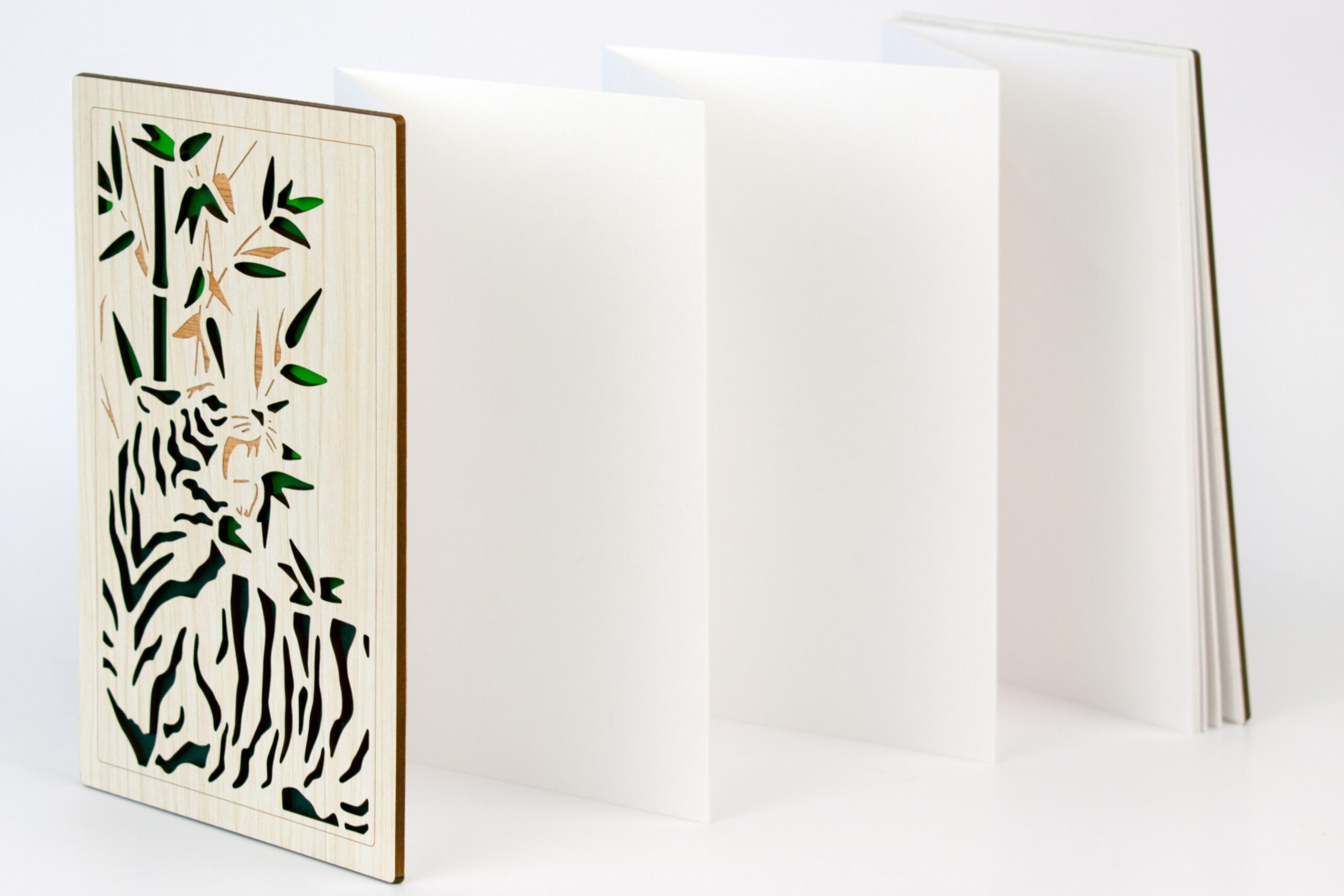 神社やお寺をイメージした木のぬくもりが伝わる御朱印帳。 レーザー加工を施した木素材で表紙を仕立てた永善のオリジナル御朱印帳です。 竹の静寂に佇む白虎。力強く、凛とした美しさを宿す一冊。 ▶ご購入はこちら