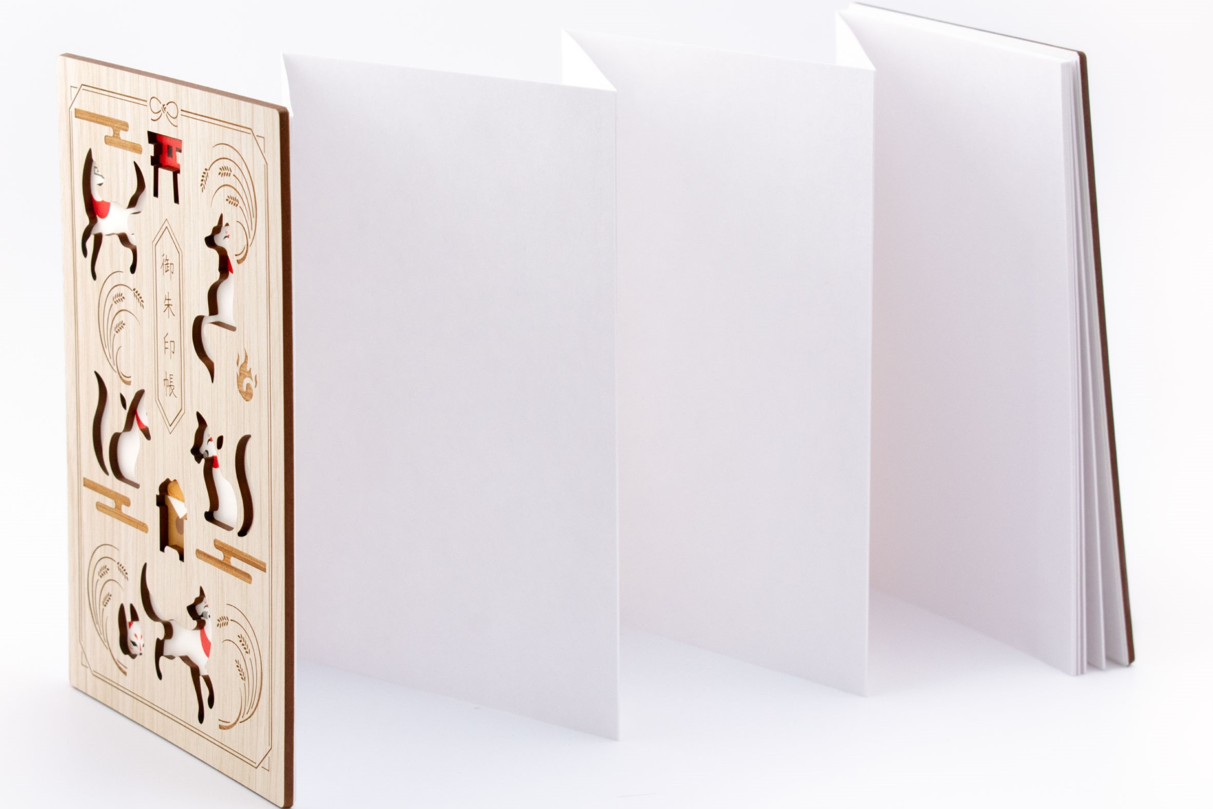 レーザー加工を施した木製素材で表紙を仕立てた永善のオリジナル御朱印帳です。